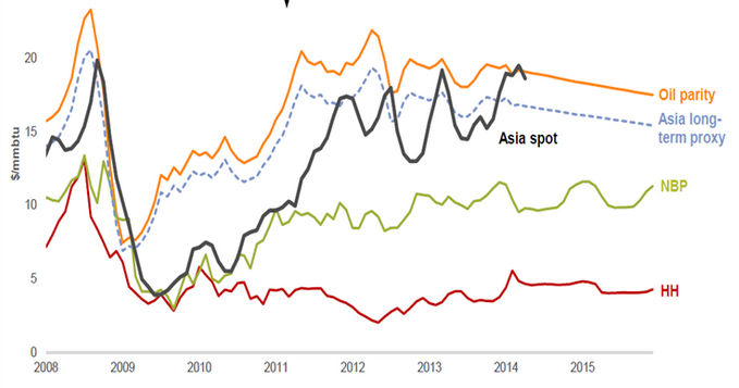 The common market for oil and gas has effectively gone. Today there is little fundamental reason for oil and gas prices to be interrelated, instead the two should be determined by their own supply/demand dynamics. And this is already seen in the market prices (see picture below). The US gas price (Henry Hub) reflecting the successes in the shale gas space unbundled from oil first. Europe where gas spot market (for imported gas) is developing fast is following the lead. Only Asia/Japan exclusively dependent on LNG-imported gas, still the tight market, sticks to traditional oil-linked pricing. Note that LNG prices will always be higher than gas prices in the places with local production, but the right reason for LNG price premium is high capital cost of the technology rather than historical pricing off oil. As global LNG capacity is growing fast we are soon to see the Asian gas market unbundling from the oil price as well (at the levels reflecting LNG economics).