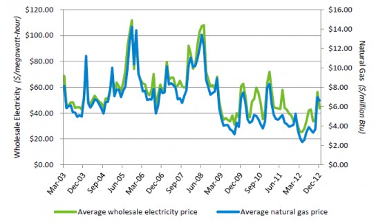 The status quo has been this. Gas was selling at whatever the price it was selling (typically priced off oil), gas-fired utilities converted gas into electricity at combustion-specific conversion coefficients, that set the market price of electricity as well as relative gas/electricity prices. But with the recent developments in the alternative energy space gas firing has now been challenged as a marginal technology to generate electricity. Solar and wind have become cost competitive in many markets gradually replacing combustion as a marginal technology (and price setter). As combustion is becoming less competitive, combustion-driven price ratios (discussed above) are losing fundamental grounds.