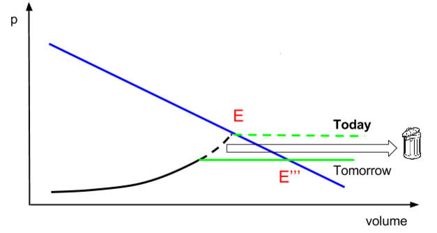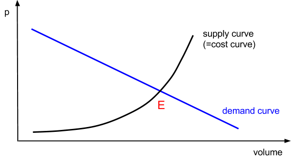 In free markets a product price is determined as a price that equalises supply and demand. Upward sloping supply curve (in price / volume coordinates) crosses downward sloping demand curve setting the equilibrium price and volume (point E in Figure 1).