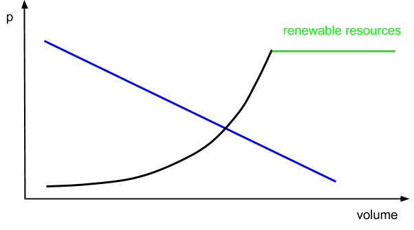 The consensus with regards to renewables (especially among the fossil fuel energy incumbents) has been the following. Renewables are expensive and will always be. But one day, a long time from now, the world running out of limited fossil fuels but staying ever hungry for energy, will eventually opt for more expensive renewable resources – the second best and the only remaining solution. In terms of the supply/demand diagrams, that would mean that the renewables part of the supply curve would eventually get closer to price/volume setting area. Renewables would become marginal producers taking non-zero market share (point E’’ in Figure 4).
